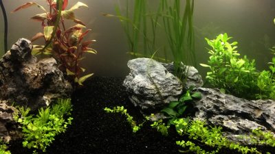 J’ai opté pour un bac planté, avec uniquement des roches en décor minéral. Sur les bases de l’aquascaping, j’ai choisi de créer un ensemble basé sur un point de fuite, pour créer une perspective.